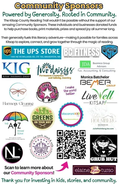 The Kitsap County Reading Trail is more than just a fun family activity—it’s a community-powered celebration of literacy, connection, and kindness. And it wouldn’t be possible without the heart and generosity of our Community Sponsors.